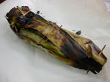 これはお菓子である。日本の「丸ごとバナナ」はスポンジ生地と生クリームで包まれてコンビニ等で売られているが、タイの物はカオニィアオ(もち米)で包まれて道端で売られていた。バナナをカオニィアオで包んだものをバイトーイ(バナナの葉)で包み、直接火に当てて焼いたもの。カオニィアオにバイトーイの香ばしさとバナナの甘さが移っている。和菓子の「桜餅」が好きな人であれば、このタイ菓子は美味しく食べられる事間違いなし。(7月4日) |