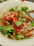 ナムトック≠ノは「滝」と言う意味がある。辞書にはそう書いてあるのだが、料理でナムトックといえば、2つの料理のことを指す。まず、豚や牛の湯通しした血が入っているクイッティアオのことをナムトックと言う。正直、最初はかなり気持ち悪かったが、勇気を出して食べると…、とても血が入っているとは分からないのである。逆に味にコクが出て結構美味しい気もする。ただ、左写真の上に乗っている赤いものはイェンタフォーで血ではないのであしからず。これは腐乳(タオフーイー)といってカビを付けて塩漬けにし、紅麹で発酵させた調味料。少量だけでもスープ自体にピンクっぽく色がつき、「ピンクの麺」を食べた事がない日本人にはちょっと抵抗があるやも知れない(私はそう)。 もう一つのナムトック≠ヘ私の好物、イサーン地方のナムトックムー。豚肉の炭火で網焼きにして、それを切って沢山の香辛料や、乾燥させ煎って粉々にしたカオニィアオ等で和えたサラダである。とにかく辛いサラダなのではあるが、私の『タイ料理大好きランキング』の上位にある。肉を焼くときに肉汁が下にポタポタと落ちる様から、「ナムトック」と名前がついたのではないかとあるタイ人の知人は言っていた。(9月4日) |