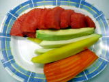 コームーヤーンはCarrefourの惣菜売り場にて炭火焼きしていた豚肉。下味として香辛料や砂糖等の調味料に漬けてあってそのまま食べてもイケル。甘辛いたれが付いていて、これに漬けて食べてると一気に辛くなっていかにもタイ料理。フルーツは上からティエングモー(西瓜)、マラコー(パパイヤ)、マムゥワング(マンゴー)。このパパイヤはまだ完全に熟しているものでないが、青くても嫌味は無い。甘みも若干控えめ。 |