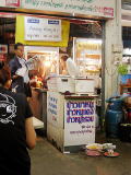 ご無沙汰してしまいました、屋台料理です。 屋台の軒先で、豚ばら肉が大きな塊のまま揚げてあるのをよく目にする。 今回は、その豚バラ肉を、適当にバンバンバンと切って、ご飯の上に乗せ、ソースを掛けただけの料理。 横には、何故か、生きゅうりと、ちょっと甘いソーセージが添えてある。 豚ばら肉だけでも結構なボリュームで食べ応え充分。 なんだか、豚肉が食べたいナーというときの、私の秘密の一品。(1月30日) |