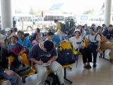 フォアランポーンはバンコクのターミナル駅とは言っても、日本の東京駅のようなせわしない感じはない。 一日の列車発着数は簡単に数えることのできる程度しかない。北のターミナル・チェンマイへ、東のウドンラチャタニーへ、そして東北のノーンカーイへ。これらへ向かう普通列車には今から10時間近く乗車するというのに、乗車率は150%を超え、人々はギュウギュウ立ち乗り状態でこの駅を出発して行く。夜21:00だというのに、私のように寝台列車に乗り込む人は僅かである。また、到着する列車からは大きな荷物を抱え込んだ人々が次々に降車しバンコクの決して暗くなることの無い闇へ消えていく。「混沌」と言う言葉の雰囲気がとても似合う場所である。 タイ国内の移動手段で最大規模のものといえばバス。鉄道路線が日本のように細部まで行き渡っていない現状を見るとそれも当然かもしれない。タイは鉄道があるからまだましである。今からいくラオスには鉄道の線路すらない。 予定ではバンコクからノーンカーイまではおよそ11時間。朝8:00には到着するはずである。朝6:00、列車の右側に広がるコラート高原から太陽が昇ってくると同時に起床。列車が駅で止まったときに現在位置を確認したところ… まだ全行程の2/3しか進行していなかった。日本のように時刻表どおりに列車が動くと思ったら大間違いであった。9:00頃、やっとノーンカーイまであと2時間ぐらいという所で列車の中にガイヤーン売りが入ってきた。バンコクでは見たことのない、一羽丸ごと串刺し。35バーツ。迷わず購入。ところが食べ方がわからない。仕方がないので、同じくこのガイヤーンを購入していた隣のタイ人おばちゃんに聞いてみると、丁寧に木をはずして教えてくれた。 にんにくが鶏肉の表面に沢山まぶし付け、木棒に挟まれられていて、調味料とともにそのまま焼かれている。鶏の首も顔も残っている状態。もしかして、ちょっとグロテスク? 一体いつに着くのだろうと思うゆっくりとした速度で列車はノーンカーイへ。結局予定より3時間遅れの11:00過ぎ、14時間を費やして田舎街の小さな駅、ノーンカーイ駅に到着した。 駅を降り立つと私たちを観光客と判断したトゥクトゥクの運転手が猛アタックしてくる。ラオスへの国境近くまでは、ナンダカンダ行ってもトゥクトゥクで行くしかない。結局一台手配し、国境を越える橋近くまで行った。タイ出国手続き後、メコン川に架かる国境橋を渡ってその数分後にはラオスの入国手続き。なんとビザ代で1,500バーツ徴収された。US30$である。高い… タイ人・ラオス人の商売人だけでなく、西洋人で大きな荷物を抱えたバックパッカー、小学校の先生なのに2ヶ月もの休暇をとって旅行に来ている韓国人女性、私たちのような日本人、様々な人々がこの国境を超えてラオスへ入国していた。 |