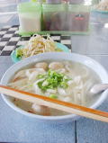 ラオス国内では幾種類かの麺料理を食した。これはその第一弾。バスターミナルに併設されていたこの店には 、これからバスにてどこかへ行くのであろう人々が、熱い朝食をひたすら食べ続けていた。スープは基本的に鶏がらのアッサリ系。麺は、ビーフンというより日本のうどんに近いものがある。左の表がメニュー。 この料理は3番。1番〜6番までが麺料理、6番〜12番はコー ヒーなどの飲み物である。ラオス文字はタイ文字と若干似ているので、強引に読めばなんとなくラオス人は理解してくれるが、一般タイ人でさえこれを全て読むことはできないようである。私の客観的な感想であるが、ラオス文字のほうが、タイ文字より丸みが多く、可愛い。ただのフニャフニャ文字ではあるが… |